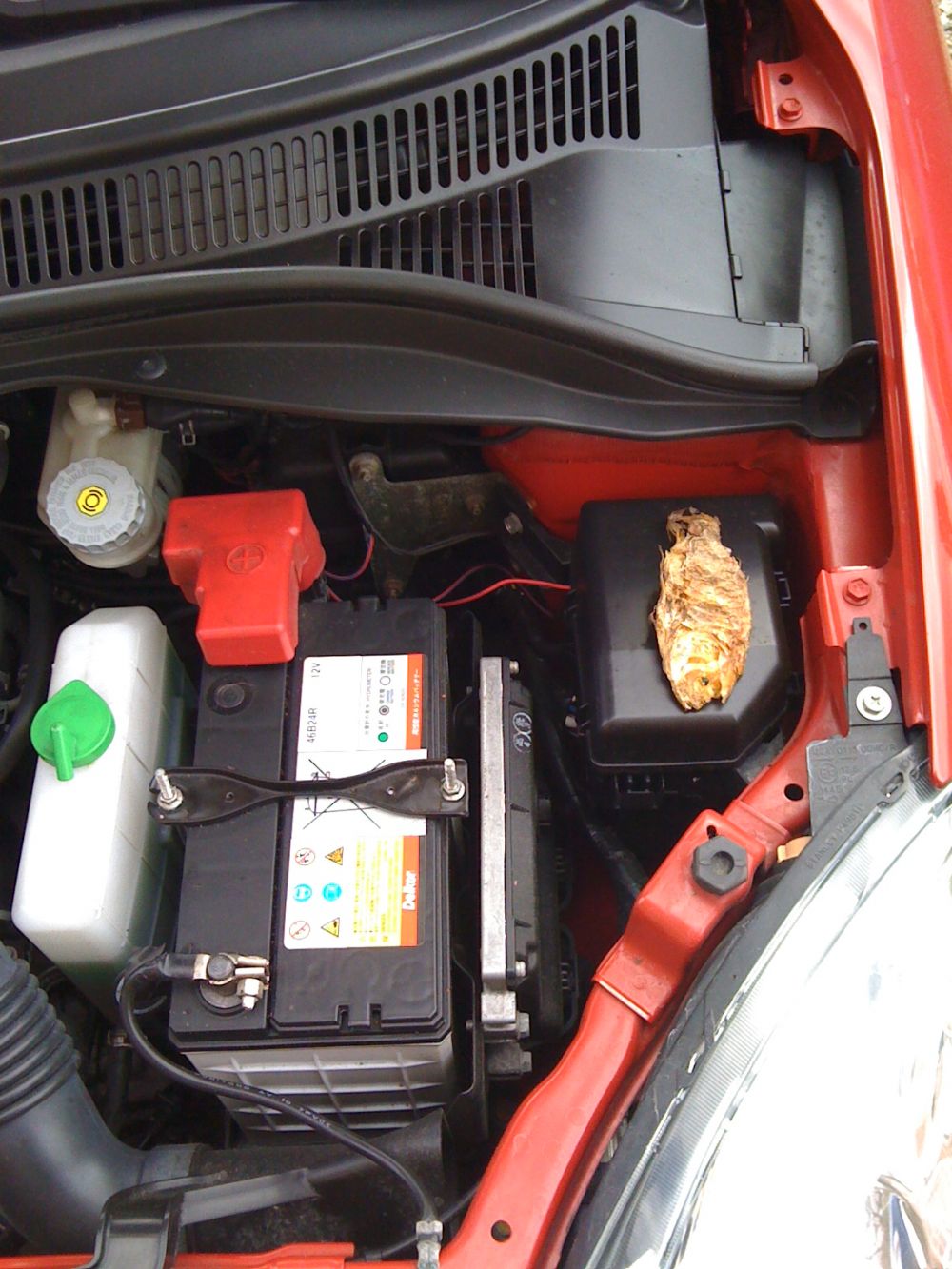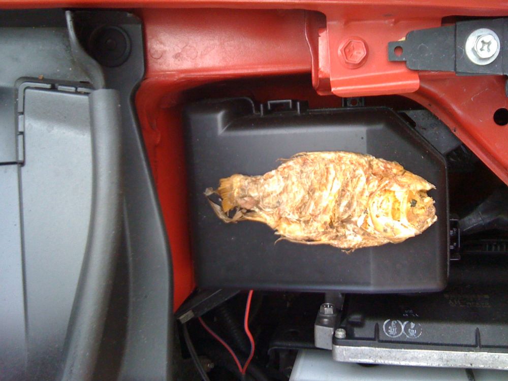 Beskrivelse: Jeg ville lige smide lidt sprinklervæske på swiften, da jeg pludselig opdagede at der var noget mærkeligt mellem karrosseriet og den sorte boks.. da jeg pillede det op fandt jeg ud af at det var en meget indtørret og død guldfisk..jeg tænker bare WTF hvordan er den havnet der???