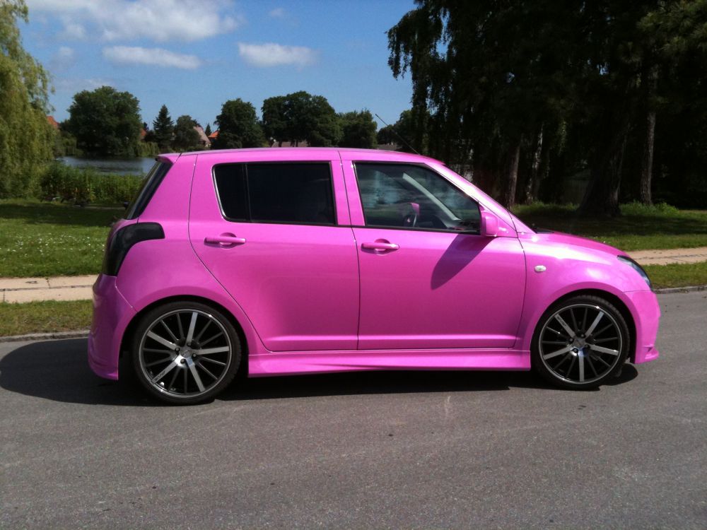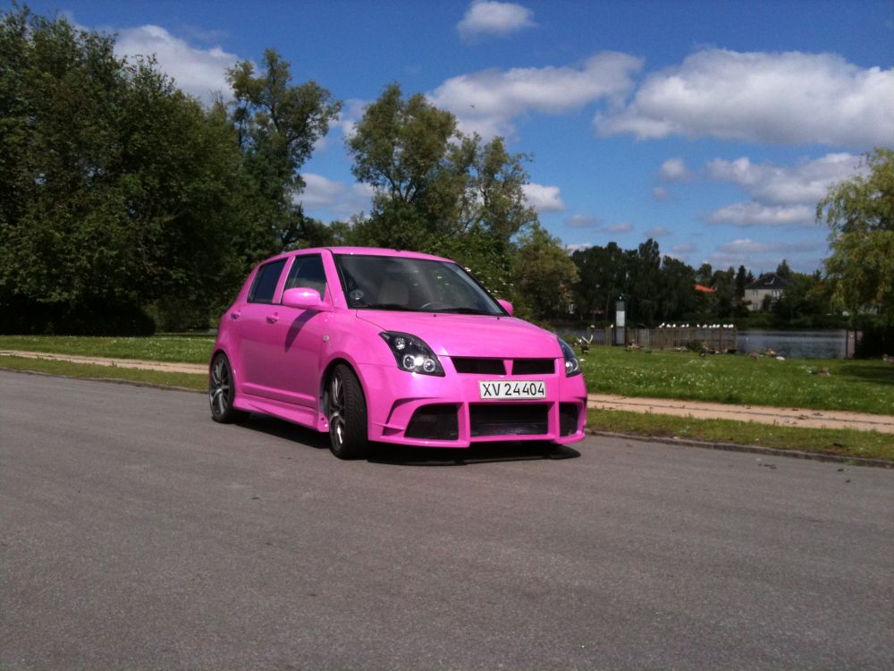 Beskrivelse: havde et uheld i februar måned så både fronthjelm, sideskærm, lygter, kofanger blev smadret. har omsider fået skiftet disse og besluttede mig for at få swift'en omlakeret i ny farve. den nye farve er super lækker, og opsigtsvækkende...en blanding af pink, lilla, og lyseblåt skær med meget perlemors effekt i.