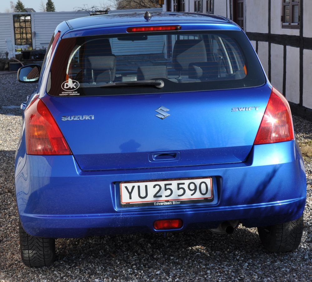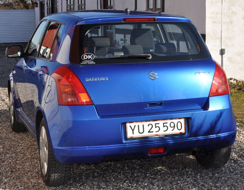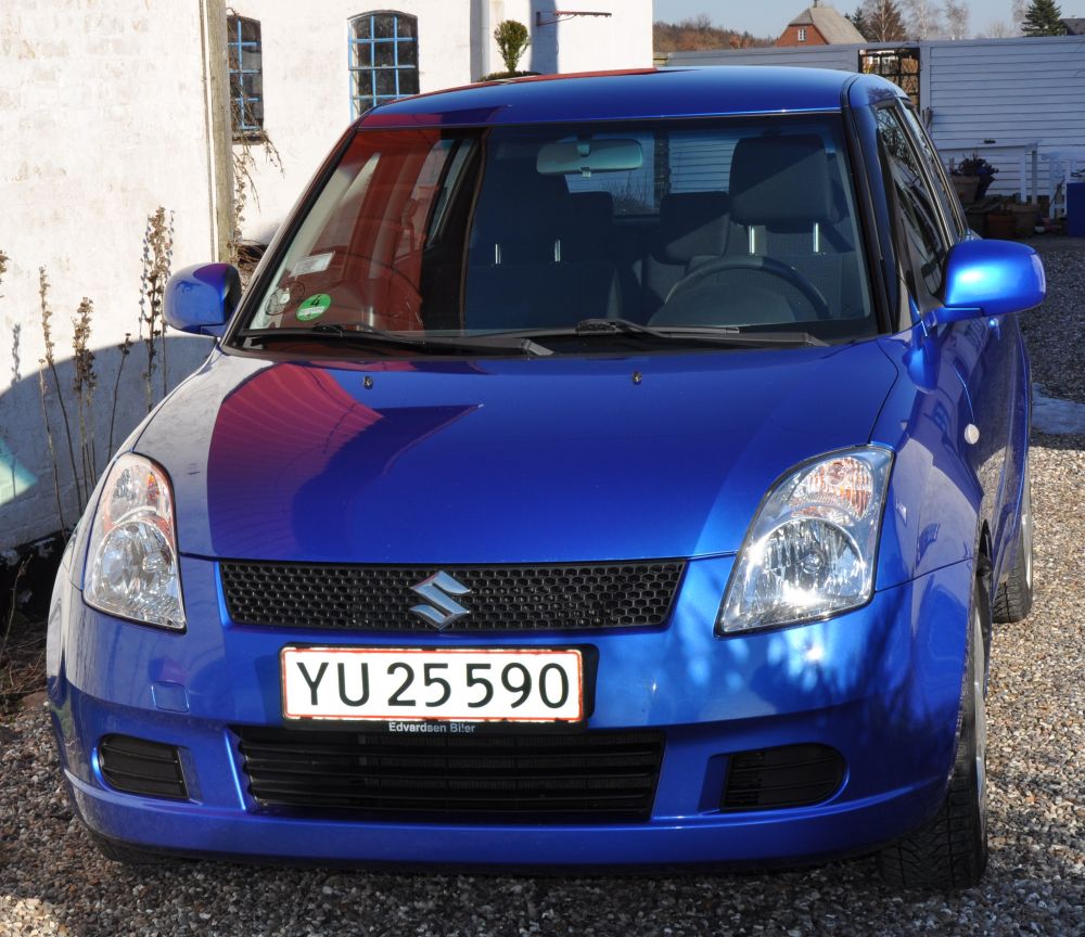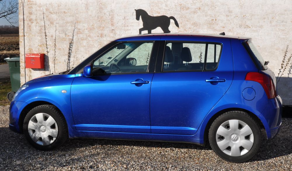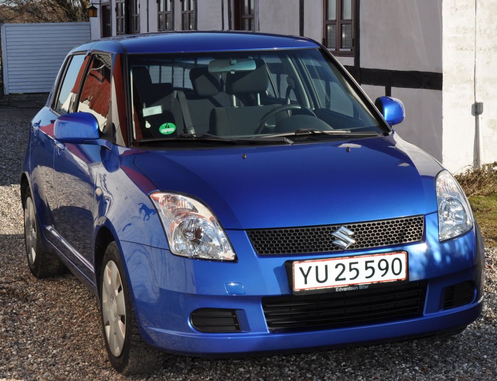 Blå metallic Swift årgang 2007 til salg. 1.3 L.5-dørs har kørt 120.000 km. Pæn og velholdt bil 15" alu-fælge med nye dæk samt 15" stålfælge med vinterdæk. Fartpilot eftermonteret. Pris 80.000 kr. Tlf. 42191828