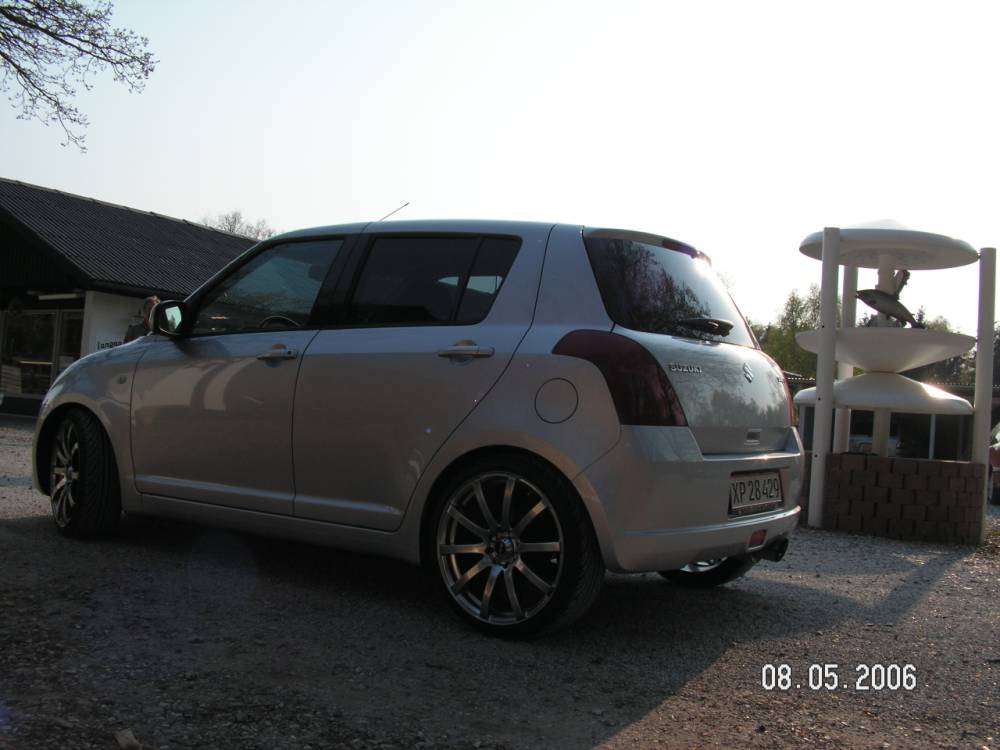 den er sænket 35mm. med Suzukis det originale. Fik tonet ruderne af nogle gutter ude fra Egå i Århus. Ved ikke lige hvad de hedder, men vil egentlig heller ikke anbefale dem. Det er fint nok, men der er enkelte fejl ved både min, min brors og min fars toning... og tak for det med lækker slæde