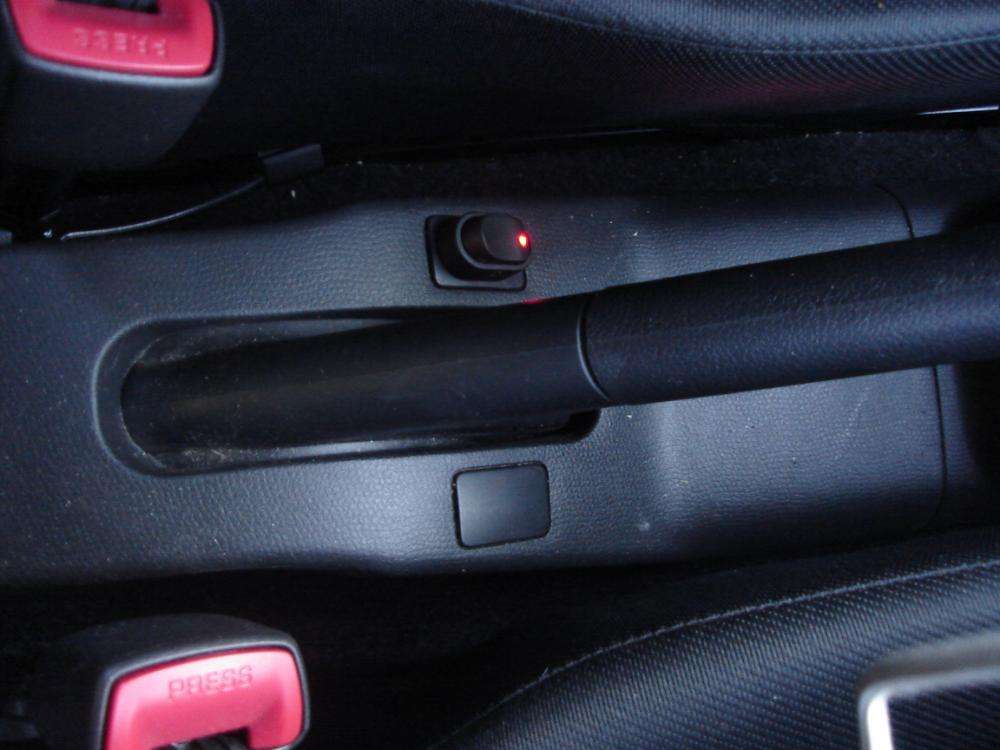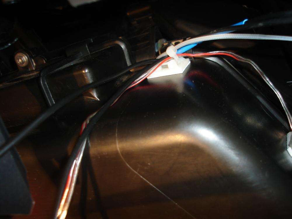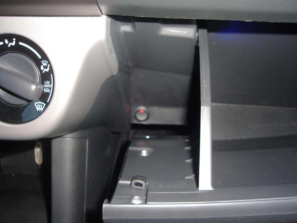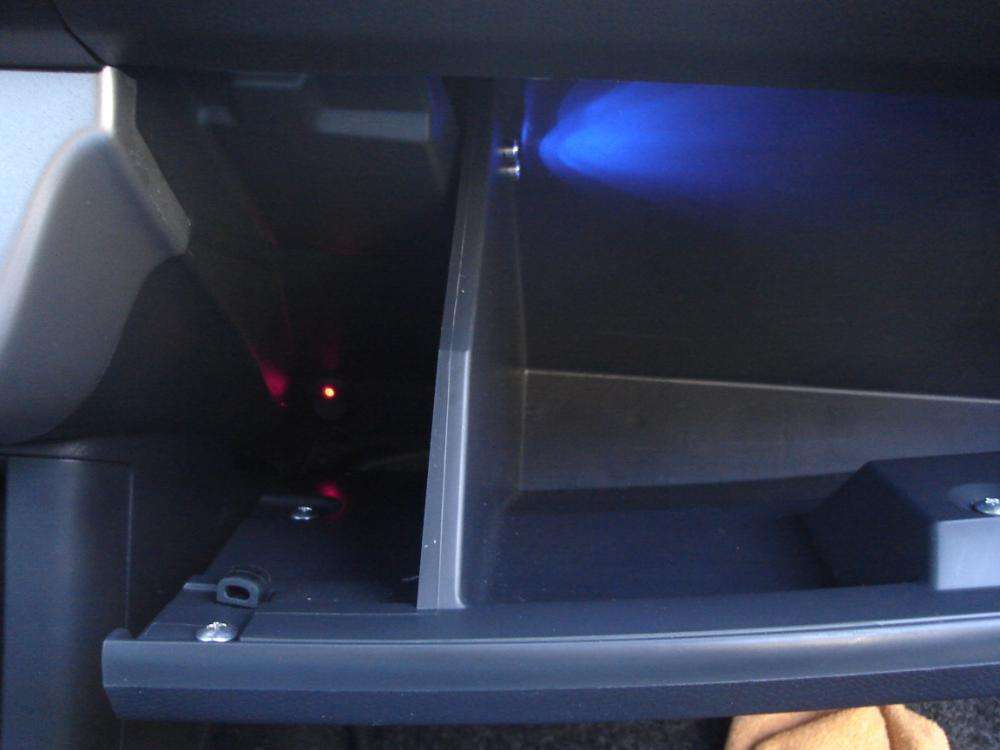 Afbryder til lys ved Blå diode, indkapslet i lille X kablet er trukket direkte fra batteriet, med 5 amp sikring ude ved batteriet! Dette og de andre kabler er ført under instrumentpanelet, hvor de er sat fast med strips, i de her specielle stribsholder med dobbeltklæbende tape! Rigtig smarte til at h 2 X Blå XLazer dioder i hanskerummet! Afbryder nedenfor til venstre(Rød LED lampe), afbryderen kan ikke ses når hanskerummet er lukket! De to blå lys er lyset i handskerummet! Knappen kan ses nede til venstre  i billedet, hvor den røde LED lampelyser, det blå er selve lyset i handskerummet!