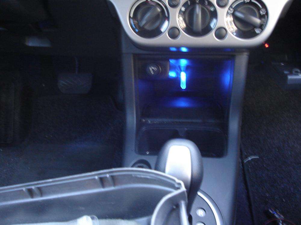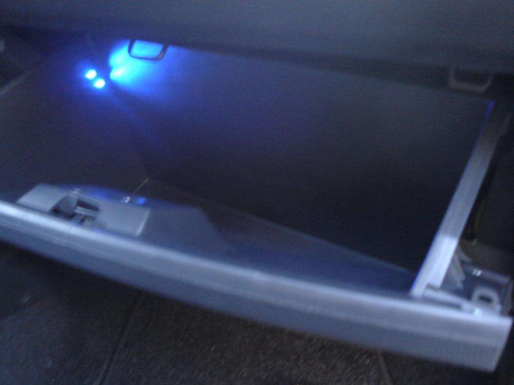 Beskrivelse: Har lavet lys i handskerum, 2 blå Xlazer dioder i 3mm stålfatninger, afbryder m/rød LED, monteret lige ved siden af selve rummet, men denne(afbryderen) kan kun ses når man åbner handskerummet!