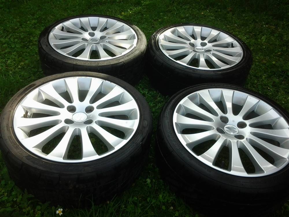 Originale 17" alufælge. Dæk skal skiftes. Enkelte småskader.